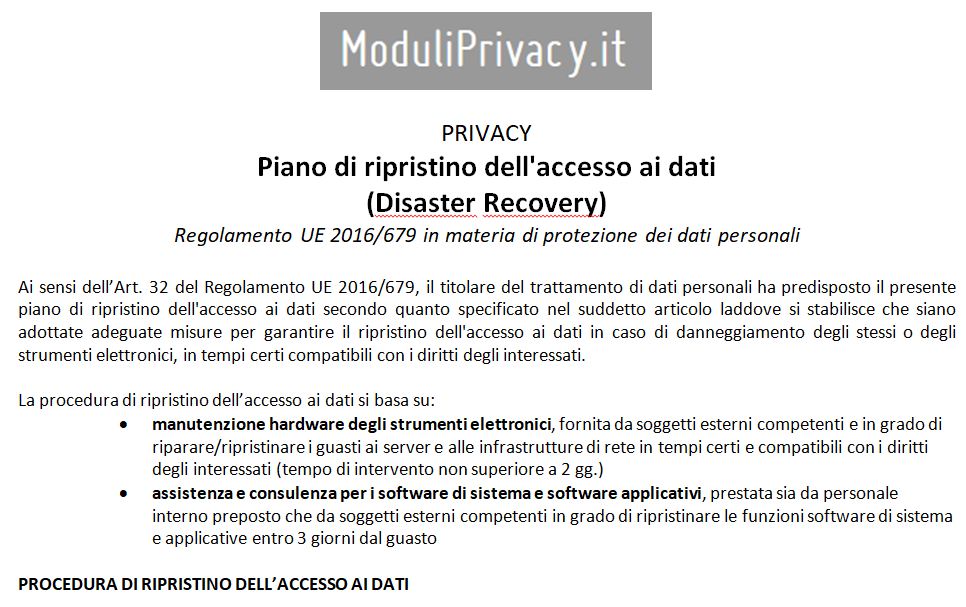 Il piano di Disaster Recovery viene previsto dal Disciplinare Tecnico laddove si stabilisce che siano adottate idonee misure per garantire il ripristino dell'accesso ai dati in caso di danneggiamento degli stessi o degli strumenti elettronici, in tempi certi compatibili con i diritti degli interessati e non superiori a sette giorni. L'esempio fornito deve essere personalizzato lavorando in stretto contatto con il dipartimento IT o con i fornitori che assicurino la corretta realizzazione del piano.