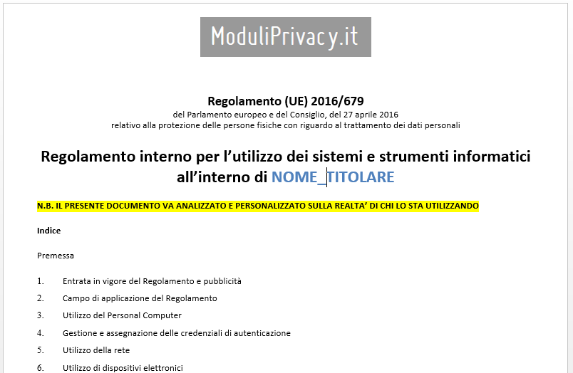 Il Titolare ha l'obbligo di formare i propri incaricati circa le procedure da seguire per il trattamento dei dati personali, incluse le regole che riguardano il corretto utilizzo dei sistemi informatici. Tale formazione può avvenire in vari modi quali manuali scritti o online, presentazioni in aula o altro. Il presente documento, che va personalizzato a seconda delle specificità di ciascuna organizzazione, può essere messo online, inviato per e-mail o stampato e consegnato ai singoli incaricati.